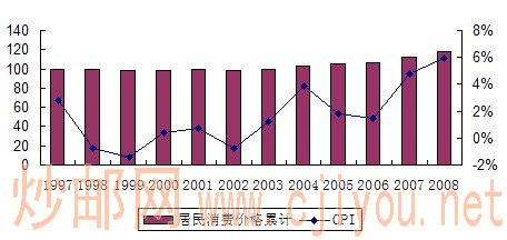 而人民币供应量的大幅增加,为什么还没有导致通货膨胀呢?中国CPI在1997年到2008年,除了2008年外,都低于5%,复合增长率仅有1.54%,对比货币供应量的复合增长率是非常之少。居民消费价格累计118.29,净增18.29(15.46%)。