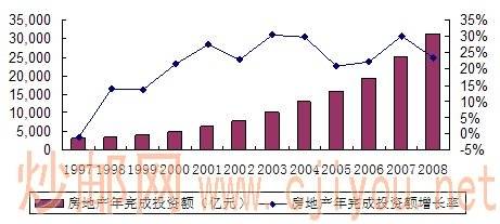 从1997年至2008年房地产年完成投资额从0.3178万亿增长至3.1203万亿,年复合增长率23.08%。从这一数字来看对比M2的净增量仅有8.12%。但是,按照一般住宅地产权限计算为70年,中国经济快速发展仅有短短的二十年不到,中国房地产投资仍然是累加状态的,因此,仍需要计算累计完成投资额。对比房地产从1997年至2008年累计完成投资额14.5151万亿元,占M2的净增量则已经超过1/3(37.78%),占扣除外汇储备的更超过50%(54.77%)。