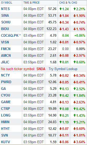 中国概念股今日普遍下跌,共有五支股票涨幅超3%: