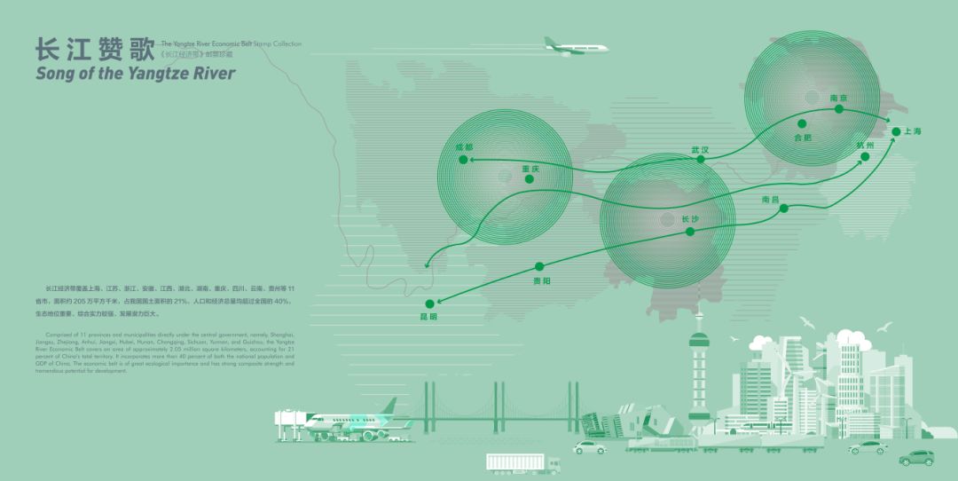 《长江赞歌》以长江经济带发展蓝图为基调,以绿色为主色,突出以绿色生态发展为主的政策方向,勾勒六省的版图,突出了“一轴、两翼、三极、多点”的发展方向。