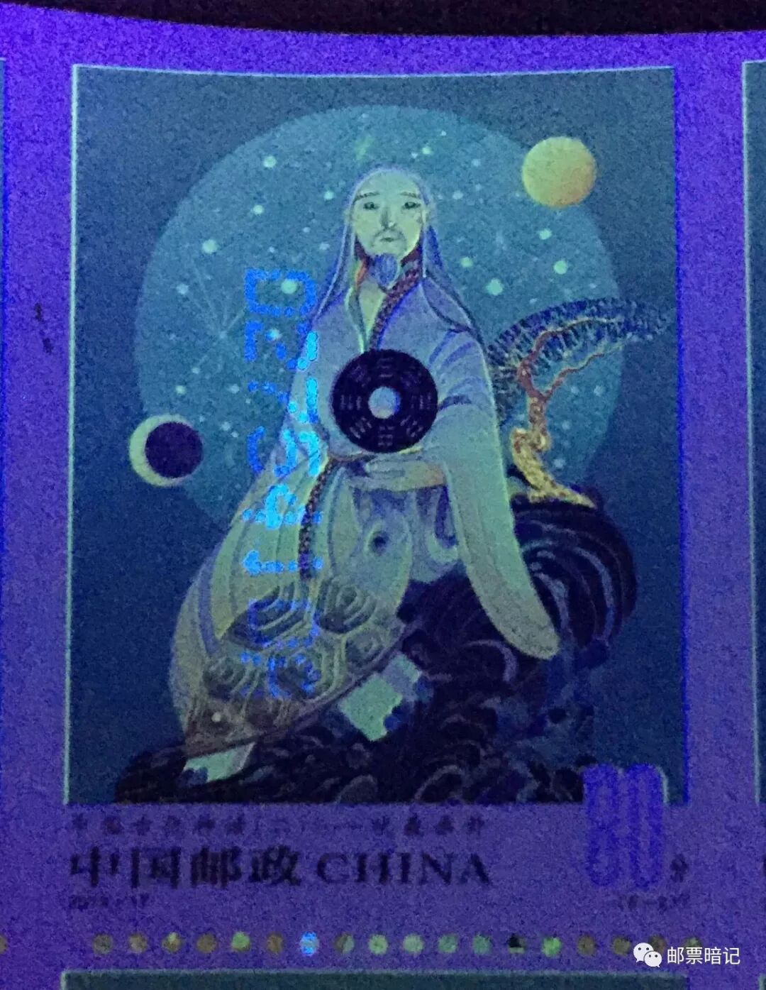 邮票图案上线条以变色珠光油墨印制,随着邮票角度的变换,这些线条也变得光润而灵动起来。