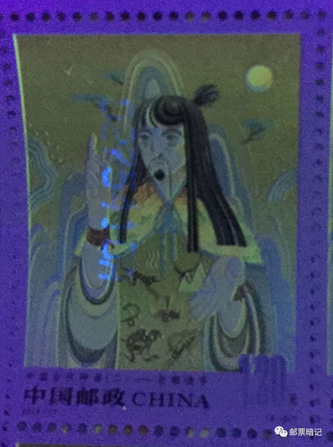 邮票印制采用高精度影写版印制,结合影写油墨高饱和度的特点,首次使用全真彩荧光油墨,在紫外光下,可以看到黄色油墨发绿色荧光,红色油墨发红色荧光,蓝色油墨发蓝色荧光,展现出五彩缤纷的梦幻效果。