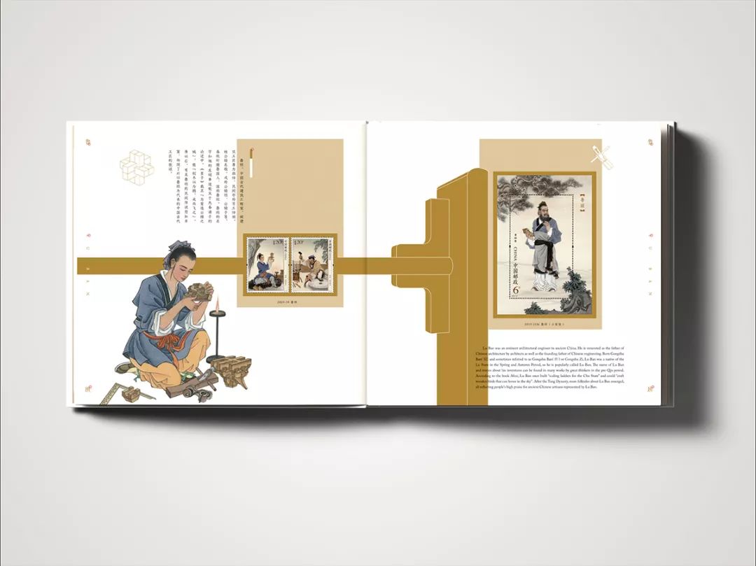 《鲁班》大版邮册的插画采用的是邮票设计者孟繁聪老师的绘画作品。邮册内含《鲁班》套票、小型张、版式一、首日封、小型张首日封。