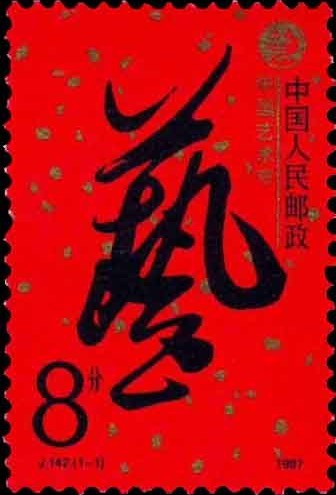 最近笔者在研究“新中国邮票中的书法”专题时,对J142《中国艺术节》邮票主图的那个繁体草字“艺”特别欣赏(见图)。龙飞凤舞的一个“艺”字,极尽中国书法线条变化圆转灵活之美,恰如苏东坡所语“风樯阵马,沉着痛快”。