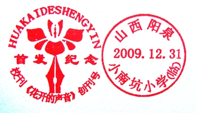 阳泉市集邮协会及基层协会使用的风景日戳、纪念戳、宣传戳总汇 日期:2010-05-08 刻制使用单位: 阳泉市矿区二矿小南坑小学 邮 戳 类 别: 临时日戳 邮 戳 内 容: 校刊《花开的声音》创刊发行纪念 邮戳使用时间: 2009.12.31 邮戳使用地点: 阳泉矿区二矿小南坑小学 邮 戳 材 质: 胶质 邮 戳 规 格: 连体戳:长:50MM__宽:25MM 邮 戳 设 计: 候慧明 责 任 编 辑: 候慧明