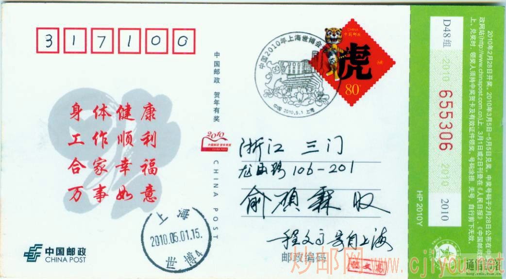 收到世博会首日实寄明信片