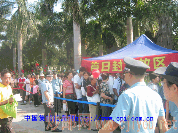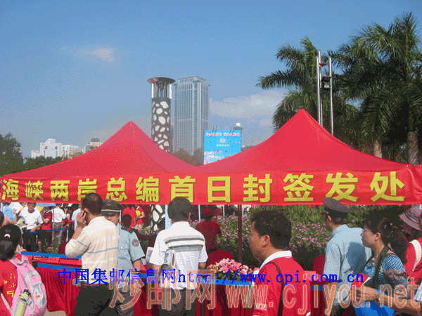 人潮汹涌啊,领取“读者节首日封”的场面最热闹,只见排队的男女老少成千上万,还好发放速度很快,大家也如同散步一般;相形之下排队等吃蛋糕的就只有稀稀拉拉十几人,真是天壤之别啊,看来不愁温饱的百姓似乎更喜欢“精神食粮”啦。所谓的“读者节首日封”,实际上是“普通邮资封加字纪念封”,每届一枚,被加字印刷的普通邮资封从第一届的“芙蓉花”,到第二届的“水仙花”,再到第三届的“鼓浪屿日光岩”,一直演进到如今第十届的“海峡西岸建设”,先后共有四种普通邮资封参与。不久前,《厦门日报》刊登了彩色的大照片,著名集邮家何大仁教授的弟弟何大汉先生展示了他自己收藏的第一届到第九届的纪念封,收藏的魅力和神奇在市民读者中引发了小小的轰动,可谓“一石激起千层浪”,许多集邮者如梦初醒,开始为自己残缺的藏品配套成龙,一时间历届“读者节首日封”成为厦门民间邮市的热点。尽管“首日封”的说法有误,但目前已经在市民中约定俗成,笔者以厦门市集邮学术委员会主任的身份多次进行了纠正,但效果不大,那“首日封”就“首日封”吧,还是闽南语歌唱的那句——“欢喜就好”!