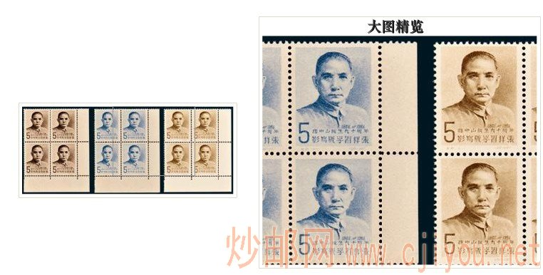 作品名称:E 1957年孙中山诞生九十周年影写版学习样张棕、蓝、桔黄色四方连各一件