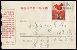 说 明 | 1968年河北石家莊寄北京實寄封一件,貼全國山河一片紅未正式發行一枚,銷河北石家莊11月26日戳,有北京28日到達戳,此封所貼為真票,且顏色鮮豔,品相極好,其銷戳及到達戳應為偽造,此封應至少為90年代初期所制參考品,曾刊登於德國CHINA PHILATELIE 1994年3月拍賣目錄封面,極具集郵史參考價值,所貼之票目前在市場價值已不菲,請預覽。 |