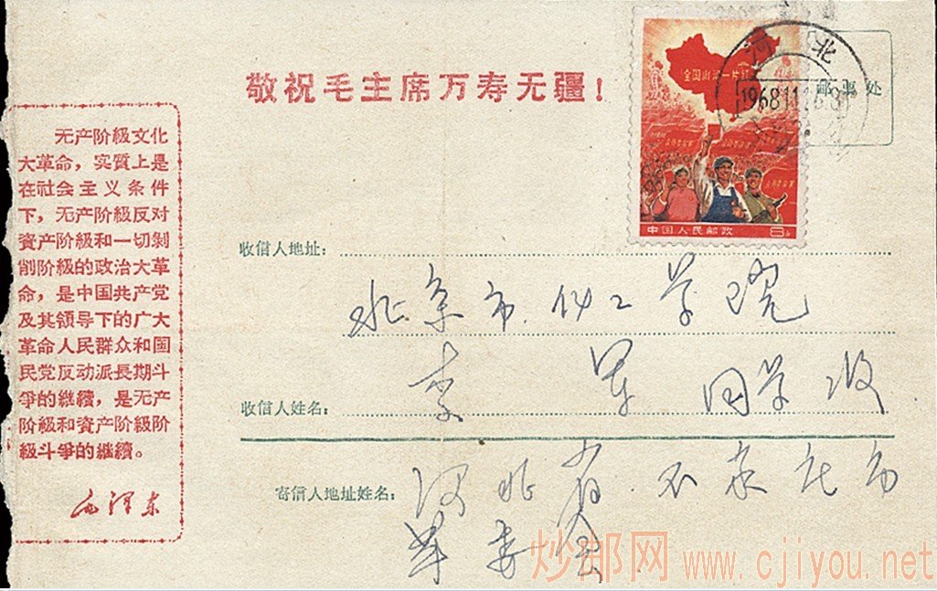 拍品名称 | 1968年河北石家莊寄北京實寄封一件,貼全國山河一片紅未正式發行一枚,銷河北石家莊11月26日戳,有北京28日到達戳,此封所貼為真票,且顏色鮮豔,品相極好,其銷 | 拍场名称 | 2011年11月拍卖会-泓盛2011亚洲国际邮展专场拍卖会 |