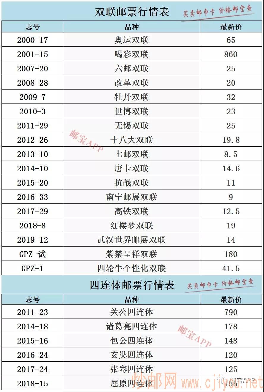 双联邮票、四连体邮票最新行情 日期:2021-03-26 双联邮票、四连体邮票最新行情 邮宝APP ·· 特别提醒:邮宝APP中所有产品的价格为市场大宗交易价格、且不含税点。零售价可能在此基础上浮动10-20%。另外,因篇幅所限,本文亦未列出邮币卡的所有品种。查询更多价格,请登录邮宝APP行情双联邮票、四连体邮票最新行情 注:转发或引用内容文字或图片请注明出处为邮宝APP