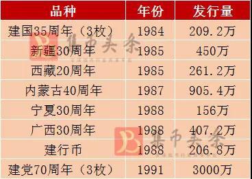 发行最多的建党70周年币也才3000万套,跟现在上亿的发行量相比,可以算是“稀有”了。
