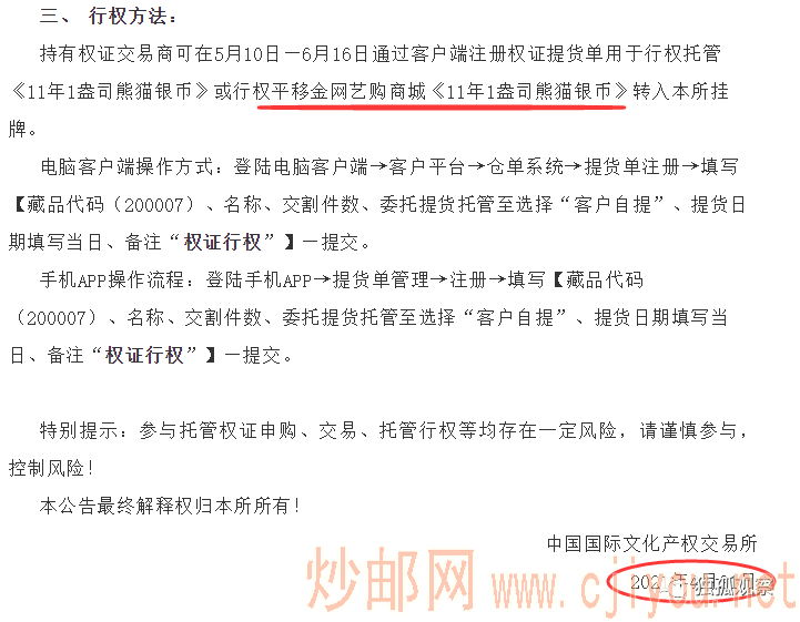 另外,这里面我们也给交易所如下建议:托管权证对标的行权品一定要优秀,11年1盎司熊猫银币基本面一般,不是好的标的物!因此,后期如果还要释放托管权证,把标的物好好研究一下吧。其次,我们再次建议交易所推出相关盘面交易藏品的认购和认沽权证,特别是认沽权证,能够向投资人提供有效的对冲风险工具,如此,才能让投资人大胆、放心入场交易、入场做多!这对于提高大资金入场,提升交易额相当有助力!