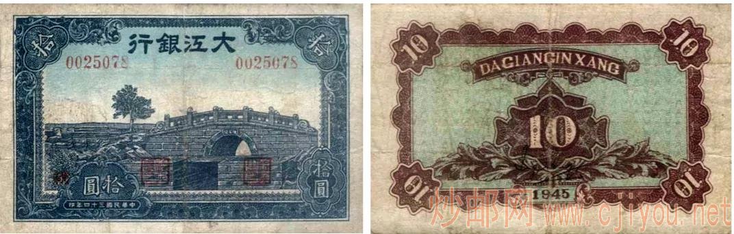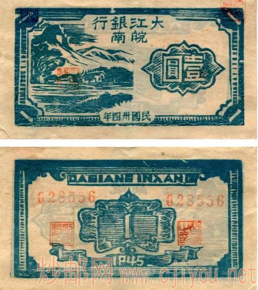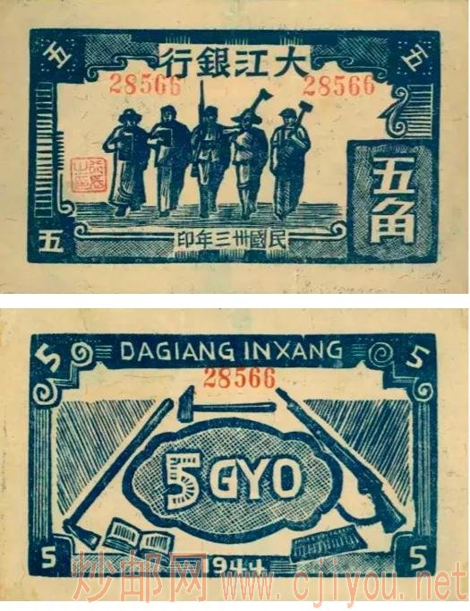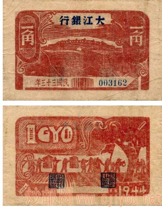 1942年5角1种;1944年1角2 种、5角2种、2元2种、10元2种;1945年5角1种、1 元5种、2元8种、5元5种、10元4种、20元2种。印 制有石印、木刻、胶印,其中木刻版别最多,胶印数量最大。钞票形制有横式、竖式二种。当时由于油墨缺乏,大江币在印刷中往往出版“正反一色、一版数色”的情况。