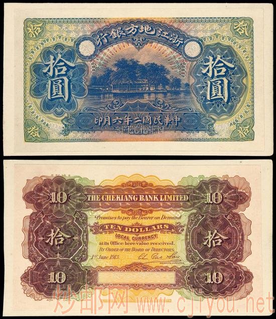民国二年浙江地方银行银元券拾圆正、反单面试色样票