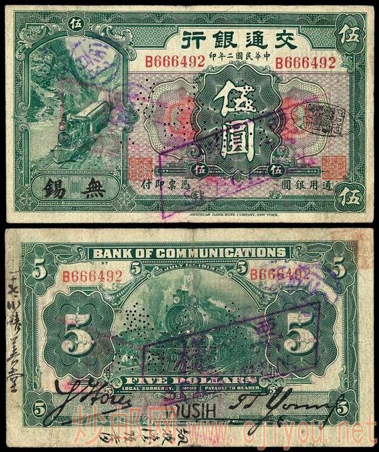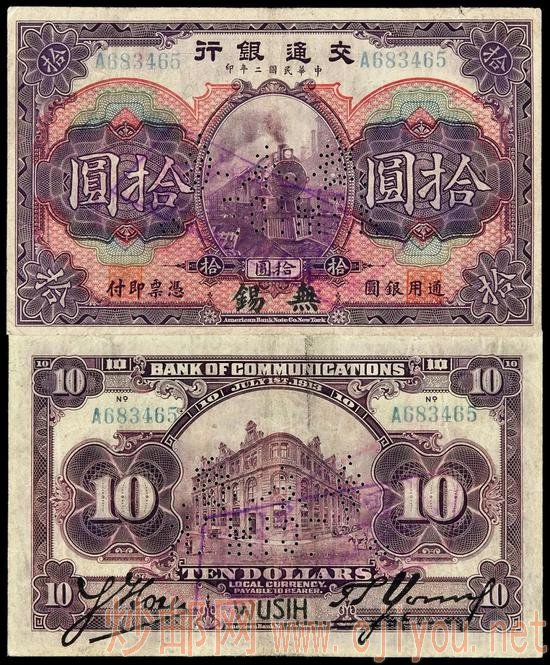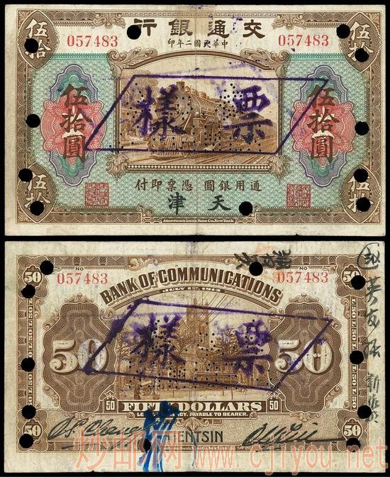 以上无锡伍圆、拾圆以及天津伍拾圆票,系交通银行于1913年发行的第四版大银元票,也是该行首次向外国印钞公订印的钞票,流通票存世极稀,改作样票者更为罕见,三种面值同现拍场,机遇难逢。
