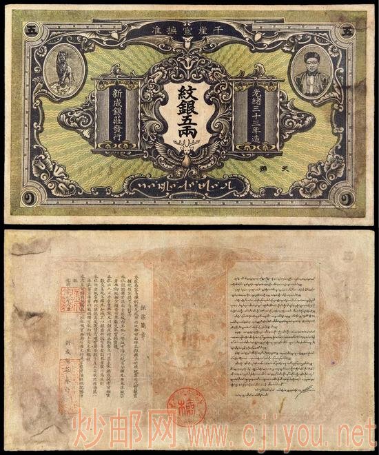 土司是元明清三朝中央政权于西北、西南地区设置的官职,由少数民族首领充任并世袭。干崖位于今云南盈江县东北部,明永乐元年(1403年)设置干崖长官司,正统九年(1444年)升为宣抚司,所辖区域相当于今云南太平江流域。刀安仁是干崖第二十四任土司和宣抚使,光绪三十二年(1906年)赴日本留学,初识孙中山、黄兴等人,并加入同盟会,成为云南最早参加同盟会的少数民族会员。翌年,日本政府驱赶中国革命党人,刀安仁被迫弃学,回国之前,他与日本东亚公司签订了在干崖合资兴办工厂的协议,并购买机械设备,聘请专家与技术人员,为回国开办实业做好了前期准备。回到干崖的刀安仁,先后创办了火柴制造、印刷、银器、纺织等工厂,开云南边疆地区资本主义工商业之先河。为便于资金周转,促进商品流通,方便贸易往来,刀安仁在干崖城内开设了新成银庄,并于当年八月发行银两票,面额有纹银一两、五两、十两三种,由日本印制。新成钱庄发行的银两票,是云南少数民族以银票为信用货币的首创者,也是研究少数民族地区经济史和民族地方史的重要文物史料。