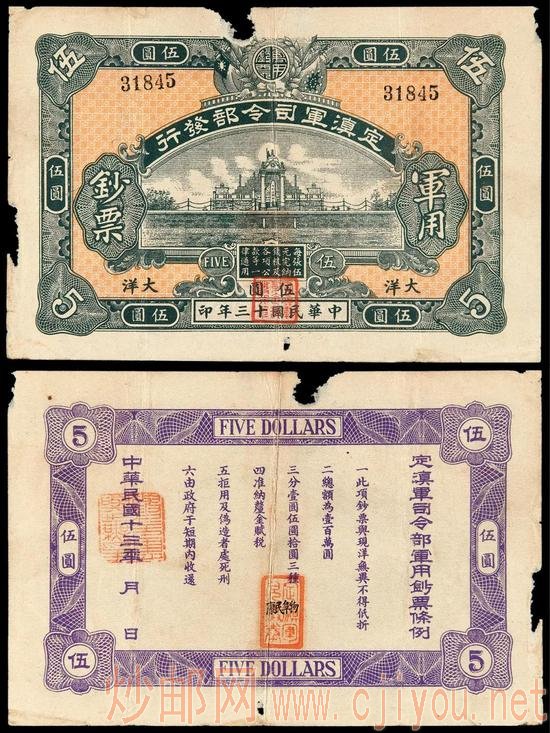此种定滇军军用钞票或许正是范石生在滇桂战役中,为应军费之需而特别印发的临时钞券,战事结束后由政府于短期内收回。此券共有壹圆、伍圆、拾圆三种面额,其中,伍圆、拾圆因发行数量较少,市场极少出现,属军用钞票珍贵品种。