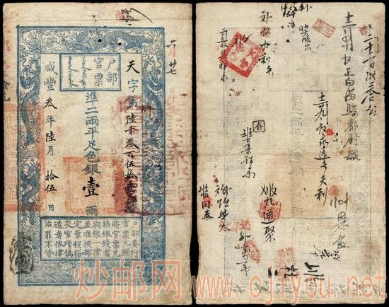 目前所见咸丰三年五月初至七月上旬所印造的户部官票,均为第一批在京师试行流通的官票。马定祥曾在《咸丰泉汇》中记述:“官票金额以墨笔临时填写者极少……仅见咸丰三年发行的一两、三两、十两三种。”足见早期户部官票手写体试行票存世之珍罕。此枚咸丰三年户部官票壹两,即第一版“手写体”京师试行票,虽已历经一百六十余年,但票幅十分完整,且版模初印,文饰清晰,乃户部官票之珍品。