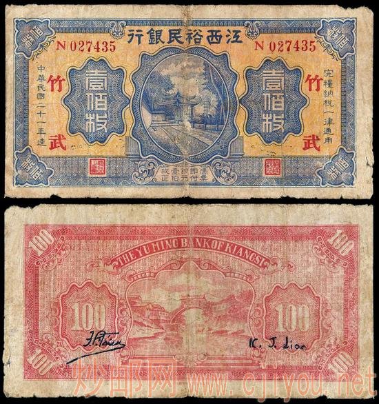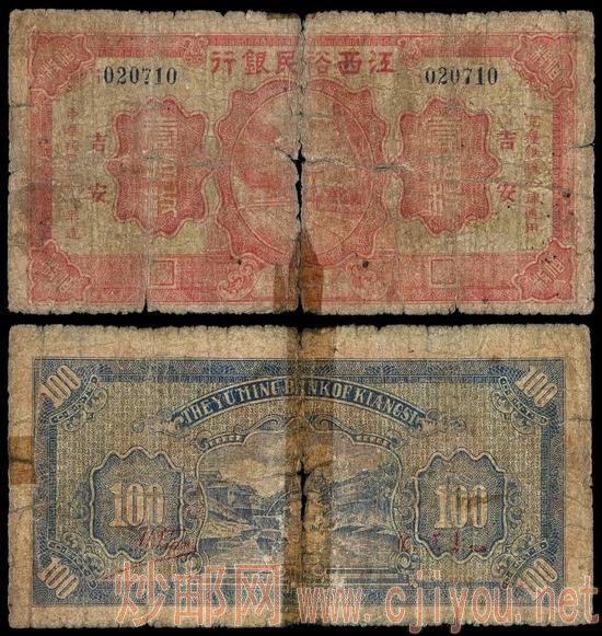 1928年1月7日,江西裕民银行在南昌总镇坡正式成立,除经营一般银行业务外,还代理省库,拥有纸币发行权。当时,江西地区辅币短缺,市面找零困难。1929年4月,裕民银行印发拾枚、贰拾枚、壹佰枚三种面值的铜元券,收兑之前发行的伍角辅币券和加盖行名铜元券。1932年3月,经江西省政府批准,裕民银行再次发行新版铜元券五十万吊,面值有拾枚、伍拾枚、壹佰枚三种。这是裕民银行发行的最后一版铜元券,存世多为拾枚面额,而最大面额壹佰枚券稀若凤毛麟角,国内外相关文献目录中,仅著录有九江、革武地名券各一枚,加盖“竹武”或“吉安”地名者,则仅发现以上各一枚,公开拍卖均属首度出现。