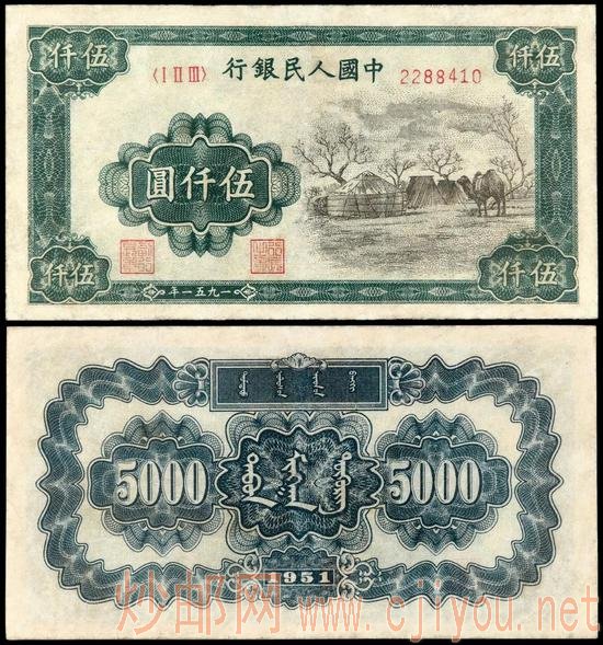 第一版人民币伍仟圆“蒙古包”流通于内蒙古地区,当时该地区除城市使用纸币之外,牧区民众尚未大范围使用货币。据记载,伍仟圆“蒙古包”的总发行量在五百万枚以内,因面额较大,退出流通时回收十分彻底,所以,留存至今的流通票极为稀少,据统计总数未逾百枚,属一版币六珍之一,稀少程度仅次于壹万圆“牧马”。此枚虽有小修,但票面无明显磨损,图文清晰,整体品相尚佳。
