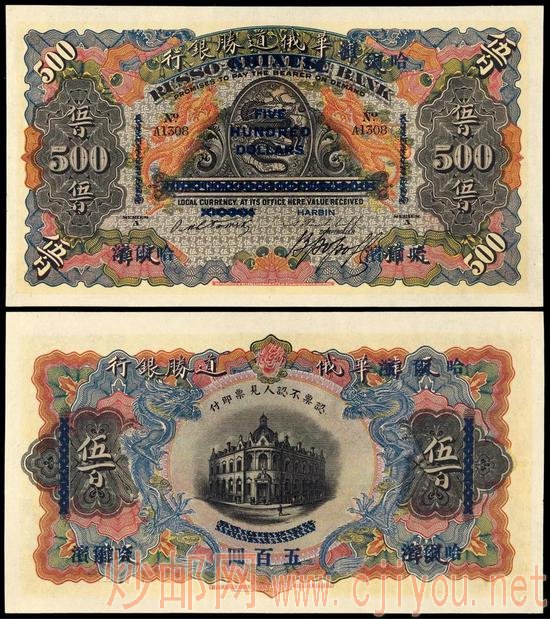 华俄道胜银行成立于光绪二十一年(1895年),总行设在圣彼得堡,在中国设有多处分支机构,如哈尔滨、上海、天津、汉口、北京、牛庄等,所发行的纸币包括银两票、银元票、金本位卢布票等。该行于1926年业务停顿后,陆续关闭了在中国各地的分行,其在中国所发行的纸币存世少见,尤其是清代纸币均已十分珍稀。此枚天津华俄道胜银行银两票改哈尔滨华俄道胜银行银元票伍百圆,是该行所发最大面额银元票,存世屈指可数,为洋商客钞珍稀品类。