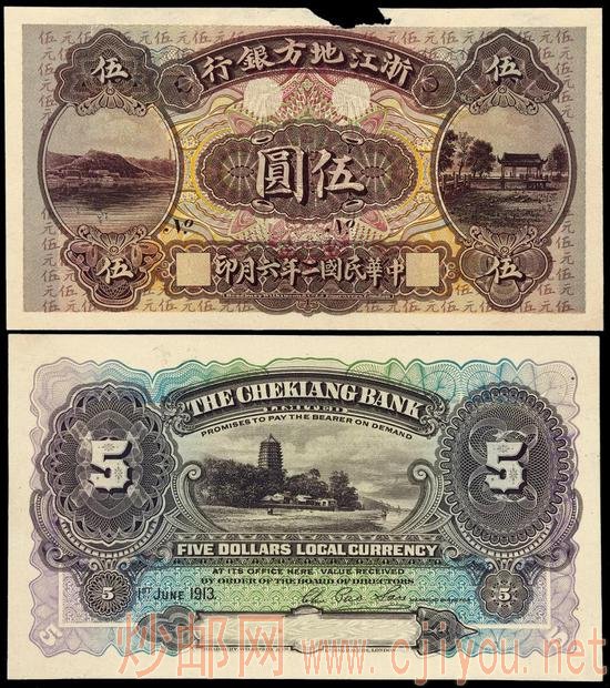 1912年初,浙江银行正式改组为中华民国浙江银行,属官商合办性质。当年,该行发行了壹元、伍元、拾元三种面额的银元券,由上海华新公司设计印制,流通不足一年,遂于次年3月开始收兑。1913年6月,中华民国浙江银行始发第二版银元券,由英国Bradbury & Wilkinson钞票公司代为印制,票面行名改为“浙江地方银行”,计有壹圆、伍圆、拾圆三种面额,正票刷色分别为蓝、紫、蓝紫色,仅有上海和杭州二种地名券。1914年,中华民国浙江银行将代理国库、省库业务全部移交中国银行杭州分行办理,领用中国银行兑换券于本地发行流通。