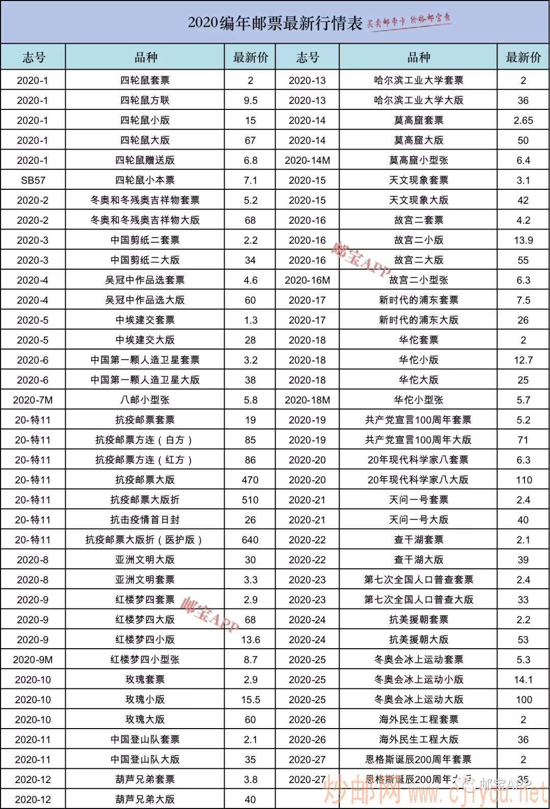 2020年编年邮票最新行情 日期:2021-06-04 2020年编年邮票最新行情 邮宝APP 特别提醒:邮宝APP中所有产品的价格为市场大宗交易价格、且不含税点。零售价可能在此基础上浮动10-20%。另外,因篇幅所限,本文亦未列出邮币卡的所有品种。查询更多价格,请登录邮宝APP
