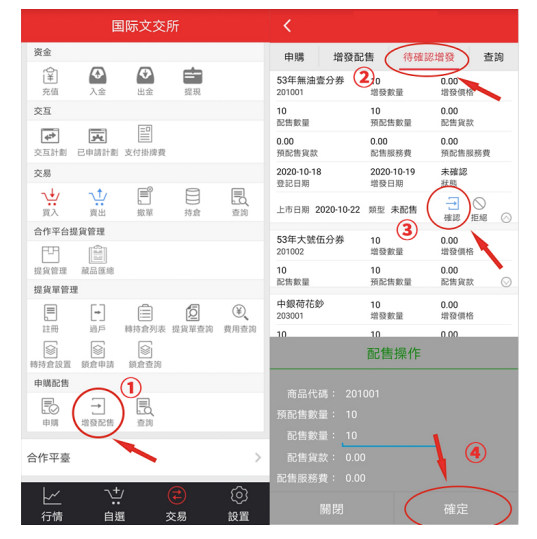 手機APP操作確認方式:登錄手機APP→增發配售→待確認增發→點擊下拉箭頭→對“配送藏品、數量”進行確認操作。