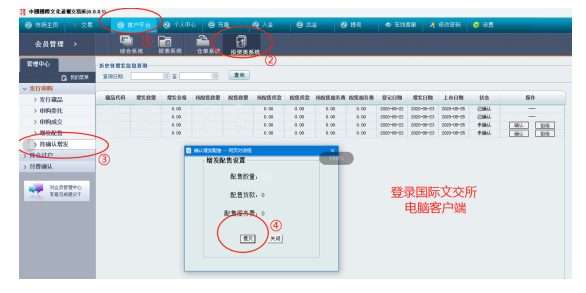 電腦客戶端操作確認方式:登錄電腦客戶端→客戶平臺→投資類系統→待確認增發,對“配送藏品、數量”進行確認操作。
