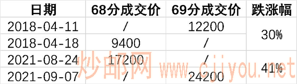 不同的分数,决定了评级币不同的价格。以1984版熊猫1盎司金币为例,69分的价格明显高于68分,而这个差距还会随着时间的推移而逐渐加大。调查数据如下表。
