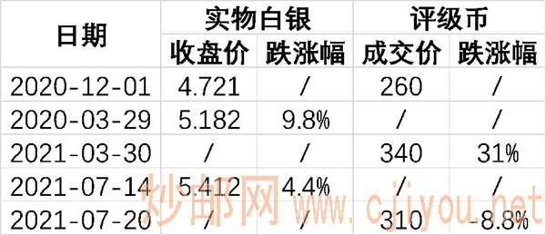 一类是近几年新发行的熊猫纪念币中的普通品种。这类银币由于时间沉淀很短,溢价并不高,被一般收藏者认为极易受到贵金属价格波动的影响。但市场形势在不断变化。评级币和裸币的价格又存在较大差异。笔者将2021版熊猫30克银币评级币(NGC MS70)的成交价与上海黄金交易所同期公布的实物白银的收盘价进行比较,调查数据如下表。