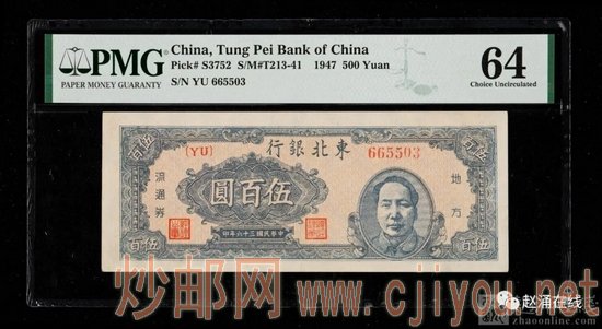 民国36年东北银行地方流通券伍佰圆一枚(亚军分数、YU665503、PMG 64)