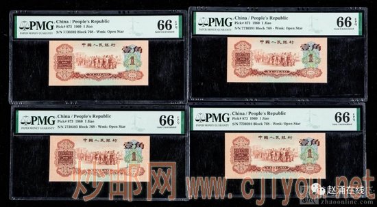 第三版人民币枣红1角连号四枚(ⅦⅥⅧ 7730391-394、PMG 66EPQ)