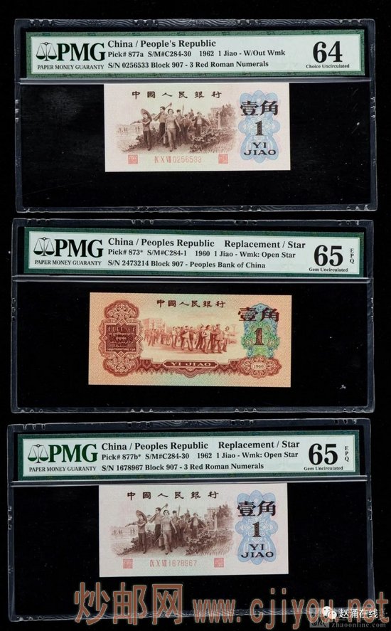 第三版人民币背绿壹角、背绿水印壹角、枣红壹角各一枚,共三枚(补号券、部分亚军分数,PMG 65EPQ、64)