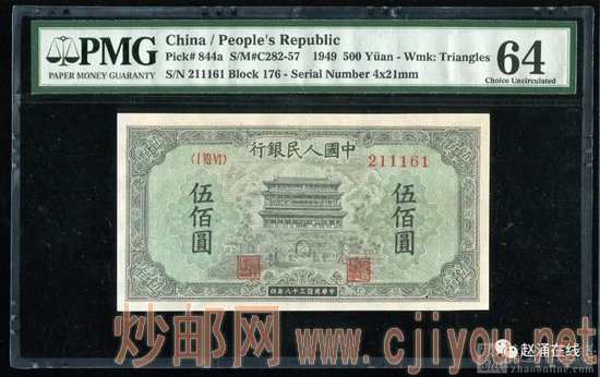第一版人民币正阳门500元一枚(ⅠⅦⅥ211161、PMG 64)