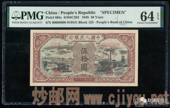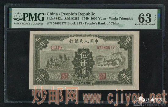 赵涌在线《百钞集萃-8月历代纸钞精品专场》于8月24日晚结束。从专场成交数据看行情,人民币依然热度不减,一版正阳门(PMG64)6.6万成交,黑面50元票样(PMG64E)5.7万成交,5000元拖拉机工厂(PMG 63EPQ)4.6万成交;三版三珍高分补号17.2万成交,背绿水印2枚连号7.1万成交。