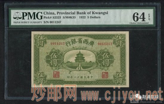 民国11年广西省银行伍圆一枚(冠军分数、仅此一枚、0011247、PMG 64EPQ)