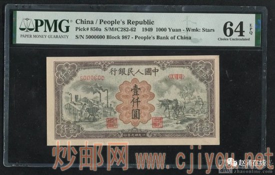 第一版人民币运煤与耕田1000元一枚(ⅨⅧⅦ 5000600、PMG 64EPQ)