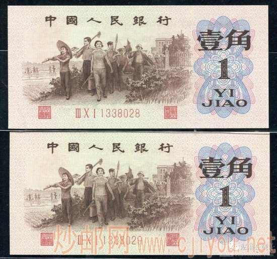 第三版人民币背绿水印1角连号二枚(ⅢⅩⅠ1338028-029)