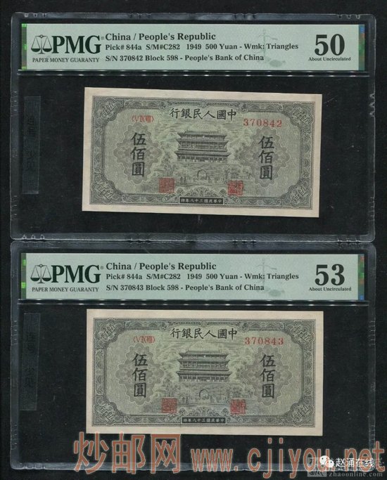 第一版人民币正阳门500元连号二枚(ⅤⅨⅧ370842-843、PMG 53、50)