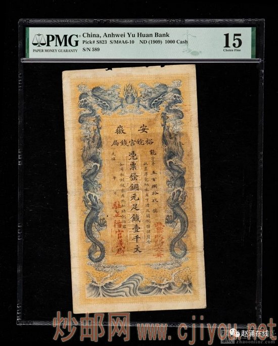 光绪 安徽裕皖官钱局壹仟文一枚(钤印“此票改归六安”“驻正阳”、PMG 15)