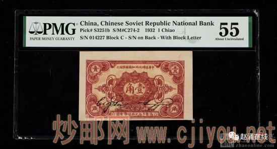 1932年中华苏维埃共和国国家银行壹角一枚(亚军分数、C014227、PMG 55)