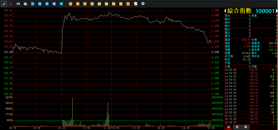 行情综述:今天白盘综合指数红盘震荡,冲高回落。收盘上涨0.8%,收在188.57点。成交0.4亿。