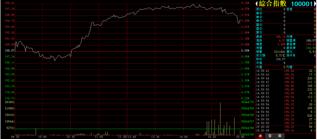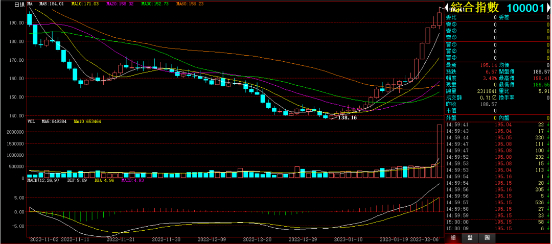 行情综述:今天白盘综合指数,开盘回落,10点半后强势上攻。收盘上涨3.48%,收在195.14点。成交0.71亿。大幅放量。