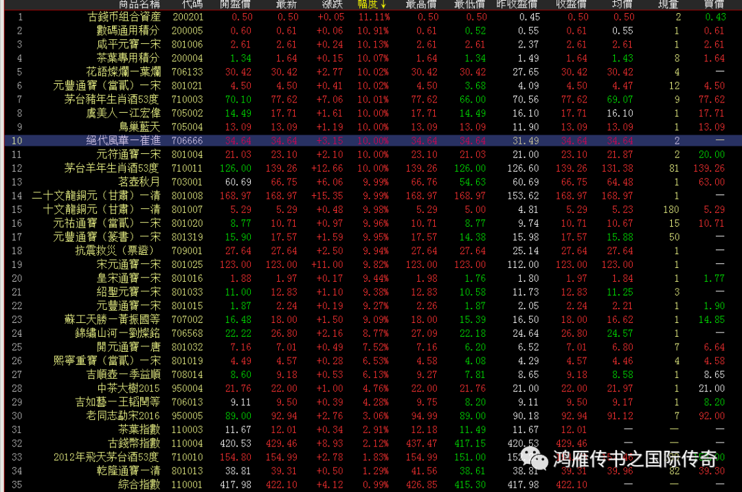 品种方面:朱系五个品种涨停,其中金银币的江南造船厂、九华山双龙拉升5个板,其中江南造船厂逼近历史新高,九华山明天突破前高;河南、八卦和五台山拉升涨停,其他品种全部由绿转红大涨,走势喜人!