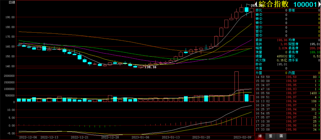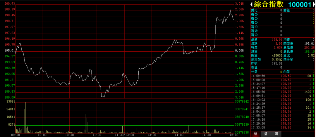 行情综述:今天白盘综合指数,上演惊天逆转。上午大跌近-3%,下午强势反弹近3%。收盘上涨2.03%,收在198.96点。200点争夺激烈。成交0.35亿,大幅放量反弹。