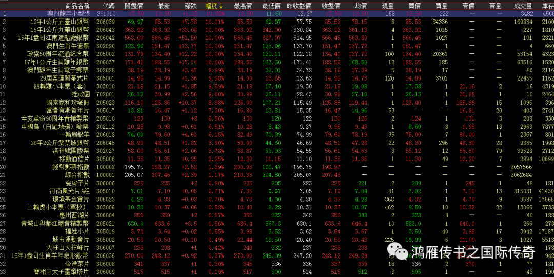 其他品种:孙系品种红盘较多,保持观望为主;曹总、仁和、中银系等品种依然分化回调震荡为主;还有澳门龙年、澳门生肖牛、澳门鸡年电子邮票以及29届涨停,29届两连板,但盘中一直有所洗筹,后续依然看好该品种;后续依然要关注两大主力品种,盘口和流动性很重要。