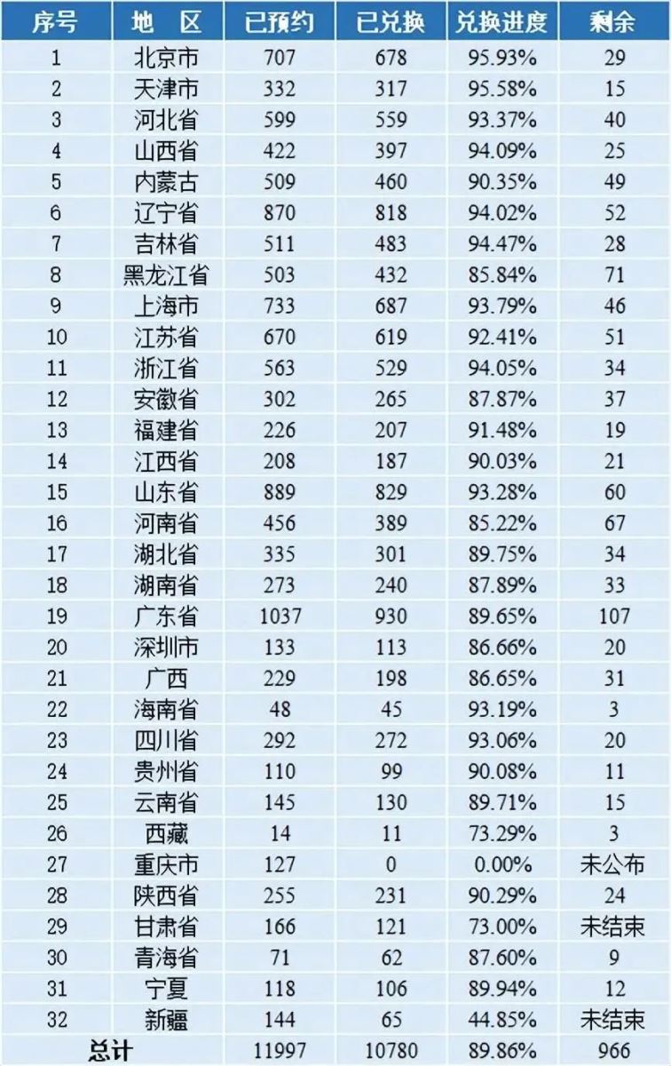 仅剩下1个地区还没结束兑换。其中甘肃已经是补充兑换了。