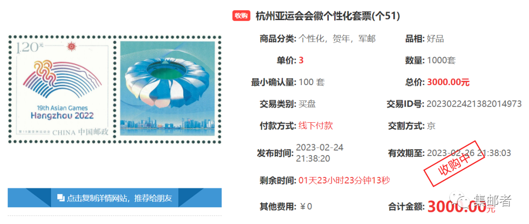 个性化邮票,除了出圈的几个品种外,表现都不好,2019年发行的《杭州亚运会会徽》个性化邮票,刚发行时大宗价最低仅在0.5元,而在2022年冬奥会时,行情开始翻红,最高在4块多!